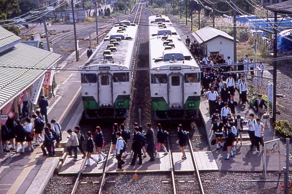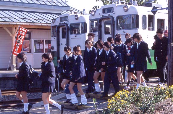 朝の坂下駅、DCの交換ともに、たくさんの学生が降りてきます。