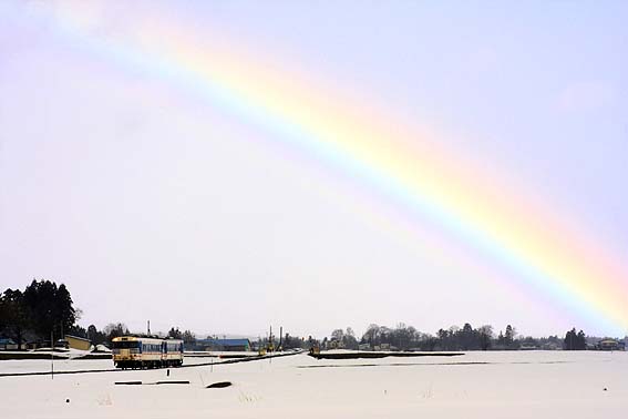 旧型DC最後の冬、日帰りで米坂線に行きました。雪原にかかる虹。