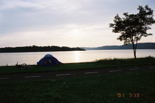 | テントから夕日を望む贅沢。網走湖 |