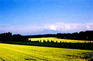 | 小麦畑にそびえる斜里岳。ん?ジャガイモの花も満開! |