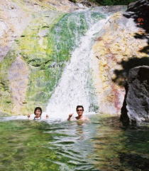| カムイワッカ湯の滝で、温泉につかる |