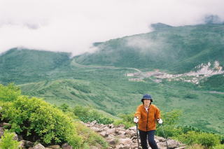 霧の中の登山、少々お疲れ気味のカミサン