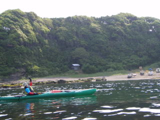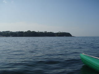 小網代を後にし、黒崎の鼻に上陸。見えるかな?左の方に僕らのカヤックが置いてあるのが。ここは四季を通じで色々な花が咲くらしい。 後ろに見えるは荒崎 |