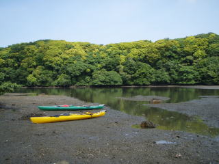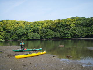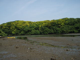 | 小網代の森に上陸。本日は大潮で、しかも今は干潮。久々にライニングダウンをしながらカヤックを引き上陸 |