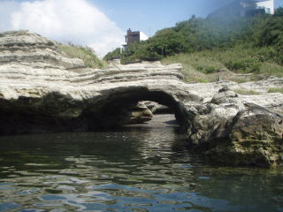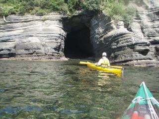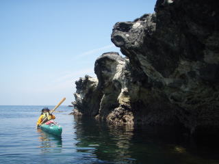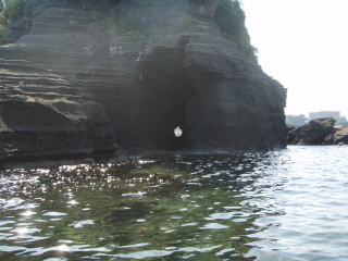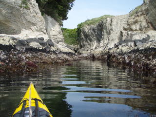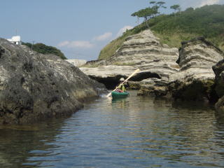 | 今回は油壺の手前の長浜(なはま)海岸から入りました。天気も良く土曜とあって、ビックリするくらいの数のカヤックを見かけましたよ。改めて三浦のカヤック人口の多さに驚かせられましたね。長浜から出て進路を南にとりブラブラと。小網代湾、油壺湾と横断。油壺湾からはでっかいヨットが引っ切り無しに出てきて、ちとびびりながらの横断でした。当たったらこっちが負けちゃうもんね。 ここ長浜から油壺の先にかけての海岸線は凄く岩場が多くプチ探検気分が味わえてとっても楽しいですよ。洞窟も何個かあったんですが通れるようなのは見つからず、ちと残念。三浦には通れる洞窟はないのかな?これからも三浦をリサーチして探してみまーす。 |