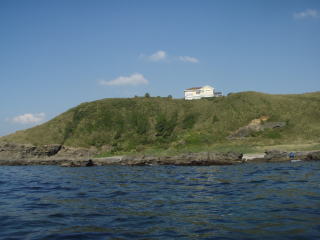 丘の上に見えるは油壺マリンパークではないか!海から見ると不思議な感じですね〜 |