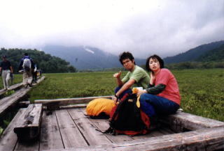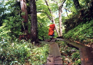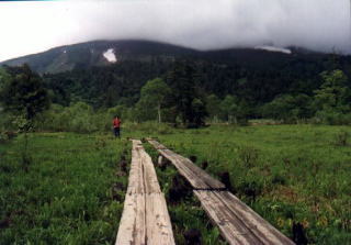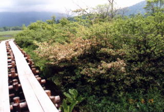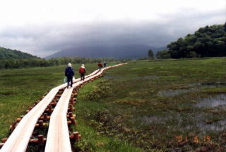 尾瀬らしい木道。晴れてれば正面に燧ケ岳がそびえる