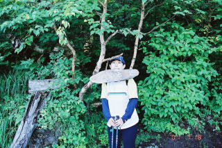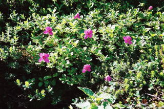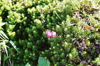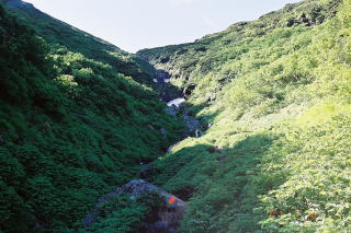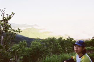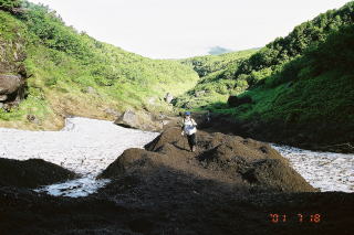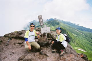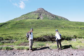そこから先はまたジグザグの登りとなり『羽衣峠』に到着。峠だからこの先は下りかと思ったらまだまだ登り、そこから10分で『大沢』に出た。 「この土は滑り止めの為に誰かが盛ったのかなぁ?」 と言うと、 「そうねー、自衛隊か何かが来て盛ってくれたのじゃないの」 「それにしても、これだけ盛るとなると凄い量だなぁ」 と、感心しつつ上を目指す。 「あそこに斜里が見えるよ」 「うわー本当だ。あんなところからチャリで来たんだねー」(我輩たちはチャリンコで北海道を旅していた) 「やー俺達って凄いよなー、ここまで漕いで来ちゃったんだからなー」 などと感慨に浸っていると、後ろから『羅臼平』に荷物をデポして身軽なおじさんとお兄さんの二人組が近づいてきた。おじさんに、 「こんにちは。やー、斜里岳が雲の上からきれいに見えますねー」 と言うと、そのおじさんはニコニコしながら、 「あれは北方領土だよ」 だって。「あー、やっちゃったー」。てっきり形が似ているから『斜里岳』だけだと思っていたが方向がまるで反対だった。雲海のため本当の海が見えず、てっきり陸がそちらのほうに続いていると思い込んでいたのが大間違い。思わず四人で大爆笑となった。 コースタイムはここから1時間と書いてあったが、「もう目と鼻の先、そんなにきつそうにも見えないしすぐ着くだろう」と余裕をかましていたら最後の最後で大きな岩場となり時間を食ってしまった。この岩場の手前には『岩清水』があったがこれが摩訶不思議で、岩から水が染み出ているのである。しかもその岩の上にあるものと言えば、『羅臼岳』の山頂に向かう岩場が少しあるだけで水を保水しておくような感じではないのにここからは水が滴り落ちている。本当に摩訶不思議である。 「後ちょっと、後ちょっとだ、がんばれー」 とカミサン(本当は自分に言っているのかな?)を励ましながら登っていると、上から降りて来たおじさんが、 「あの上の岩、おっこってきそうだから、あんちゃんたちもこうやっていつでも隠れれるようにしとったほうがいいぞー。ハッハッハァー」 と笑いながら、近くの岩に隠れるしぐさをした。それから続けて、 「もう少しだ頑張れー」 と言って下っていった。何とも面白いおじさんだ。僕たちはおじさんにも励まされ、9時20分無事『羅臼岳』に登頂した。 「こんにちは、ここいいですか?」 と言って中年夫妻の横に陣取り、山頂でお湯を沸かす。朝飯だか昼飯だか分からないが(時間的には朝飯なんだけど、すでに起きてから六時間たっているからね)ラーメンを作って食べていると、何やら怪しい男の二人組が「こっちの知床峠の方に下りたほうが近いんじゃない」などと言いながら登山道とは違う方向へと降りていった。カミサンと、 「あの人たち危ないねー」 と言いながらラーメンをすする。 頂上で一時間くらいゆっくりと休憩を取り下山した。 「下りの岩場、大丈夫かなぁ?」 と心配していたカミサンだったが、下ってみると案外楽で、あっという間に降りてきてしまった。そこから先は頂上であった中年夫妻との「抜きつ抜かれつ」のデットヒート(?)となる(別に競争していたわけではありませんよ)。『大沢』までは変化に富んでいていいのだけれども、そこから先は長くだれ気味になる。カミサンも大分お疲れでのようで、何回も後ろから「ズルッ」と音が聞こえ、大分足に来ているみたいだった。下山途中カミサンに、 「今日の宿はどうするか?」 と言うと、 「もう疲れたし、木下小屋に泊まろう。それにYH泊まると高く尽くし、食料もまだあるしね」 との答えが返ってきて、今回の閣僚会議はあっさり終わった。 長い長い下りもようやく終わり15時前に無事小屋に帰ってきた。小屋からは話し好きの従業員(後で名前を阿久津さんと聞く)さんが出てきたので、 「もう1泊いいですか?」 と聞くと、 「どうぞどうぞ」 と言ってくれたので本日も『木下小屋』に泊まる事にした。 小屋の外には、若いライダー君が1人いた。話し掛けると、今日小屋に泊まり明日登山するとの事。買出しに行きそうな雰囲気だったから、 「買出しに行くの?」 と尋ねると、 「えー、ウトロまで」 との答え。ラッキー! 「じゃ、ついでに頼んでもいい?」 「いいですよ」 と言う事でビールを三本とチュウハイ1本をお願いした。ありがたやー、ありがたやー。 「今日は登られたのですか?」 と尋ねてきたので、 「はい、羅臼岳に行ってきましたよ」 と答えると、 「昨日、僕達は羅臼平に泊まって今日降りてきたから、どこかでお会いしているはずですね」 僕とカミサンは酒の入った頭をフル回転させて今日の記憶を思い起こしたがなかなか出てこない。するとカミサンが、 「もしかして、羅臼の頂上から反対方向に降りていった人たちですか?」 と言うと、 「そうです。あっそうだ、君達も青い同じ帽子をかぶっていたでしょ」 「そうです、そうです」 やっと、お互いの記憶の接点が見つかった。教授と