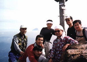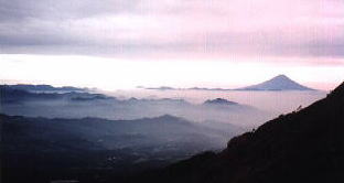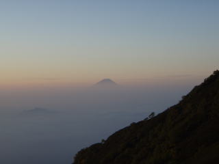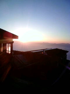 | 翌朝は快晴。山から見るご来光は最高だね。左は富士山 |
