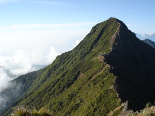 赤岳から見る稜線。尾根を境に雲が真っぷたつ |