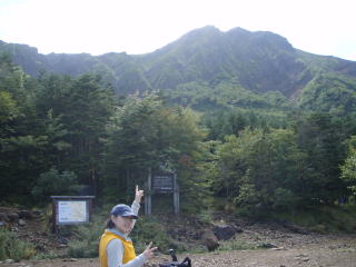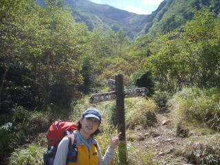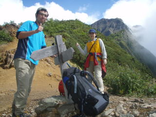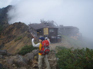 | 行者小屋に到着。目指すは指の先、赤岳! |