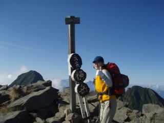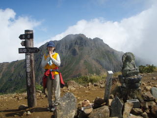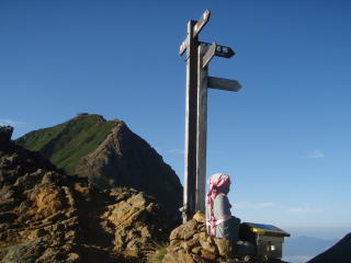20分ちょいで阿弥陀岳山頂。赤岳がバックにそびえたつ。阿弥陀岳だけに、阿弥陀さまが鎮座されていた |