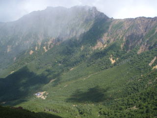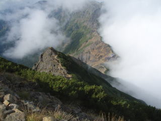 | 後ろを振り返ると今通ってきた稜線がきれいに見えた。赤岳の中腹に昨日泊まった赤岳展望荘が見える |