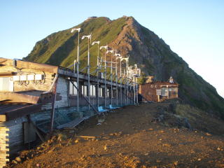 | 朝日を浴びる、赤岳と赤岳天望荘 |