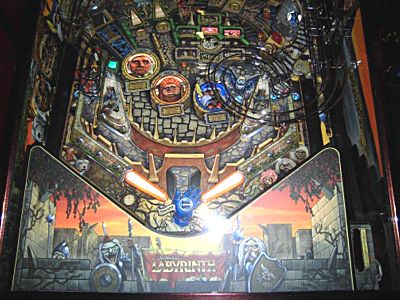 | ▲ここも通すのが難しい左オービット。スピナーの奥には更に1枚ドロップターゲットがある。 | ▲プレイフィールド全景。ラビリンスの世界を再現! | ▲障害物の様に感じる赤色スタンダップだが、芋虫リットやロックリットを進捗させる役割がある。 |