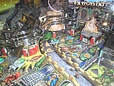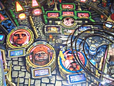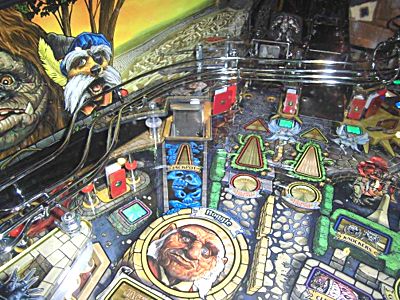 | ▲サイドループ,サイドランプが高架下に。自分がこびととなって駆け回りたくなるようなプレイフィールドデザインだ。 | ▲こちらもお見事。シアターオブマジックを彷彿とさせるホースシューの間には賢者が佇み、その手前にスクープを遮る1枚ドロップターゲット。 |