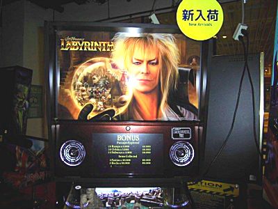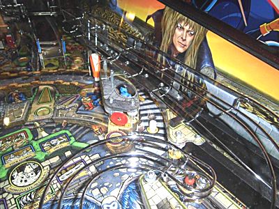 | ▲このエプロン部分も含めアートワークが大変に麗しいのだが、同社はピンボール産業経験者に拘らず、世界中からラビリンス通を抜擢している | ▲故デヴィッドボウイ扮するジャレス王が不敵にほほ笑むバックグラス。LEDが舞うような照明付きスピーカーにもご注目あれ |